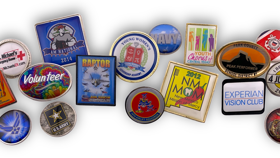 ✪ Your choice of shape, plating color, single-side imprint type & poly dome (Vibraprint), military clutch or magnet back attachment, and individual poly bag.